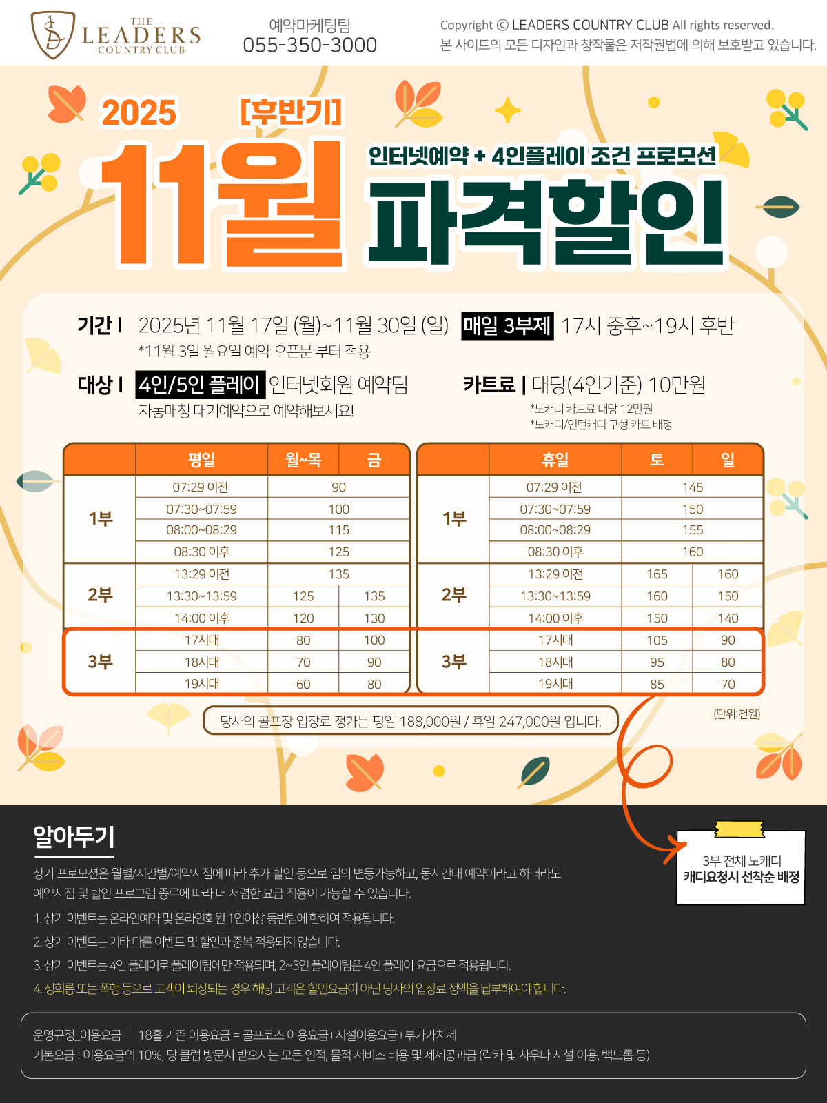 이상의 리더스컨트리클럽 골프장이용약관은 2023 년 3월 1일부터 적용됩니다.